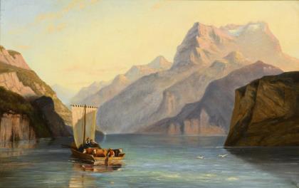 DUNTZE, Johannes (1823 Rablinghausen - 1895 Düsseldorf). Alpensee mit Boot.