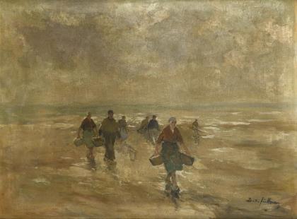Männer und Frauen mit Körben am Strand unter leicht bewölktem Himmel