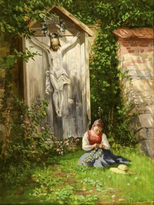 Mädchen mit Blumenkranz auf einer grünen Wiese nahe einem großen Kruzifix