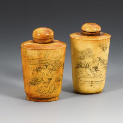 Konische Formen aus bräunlichem Bein, mit gravierten Darstellungen. Passende Stöpsel, einer mit Lanzette