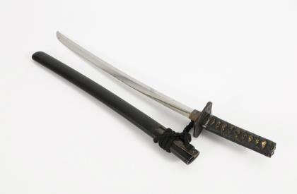 Einschneidige, leicht gebogene Klinge mit Spitze in der Rückenlinie. Habaki aus Kupfer, quadratische Tsuba mit Vogel auf minimiertem Pflanzenstengel. Fuchi mit kleinen, reliefierten Reihern, wie auch auf der kashira (Knauf). Griff mit Rochenhauteinlage und menukis. Holzscheide mit kogatana, schön austariertes Messer mit reliefiertem Griff (Menschen in einem Boot)