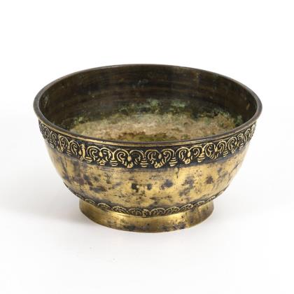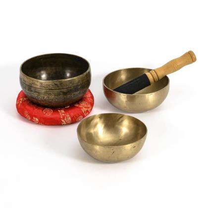 Eine ältere Messingschale mit zwei verschiedenen, geätzten Schriftzeichen auf Unter- und Innenboden sowie umlaufenden Text- und Musterbänder auf Außenwandung. H 7,5 cm, Ø 14 cm. / Dazu zwei jüngere, glatte Messingschalen mit Klöppel und stoffbezogenem Ring. Ø 13 und 14 cm