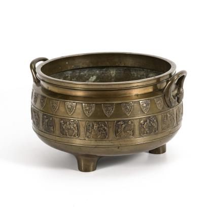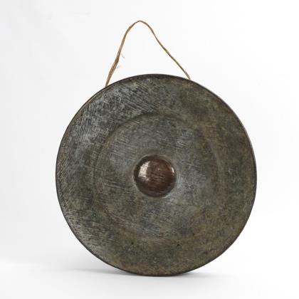 Aus getriebener Bronzelegierung mit teils polierter Oberfläche. Mit Aufhängung aus Bambusfasern