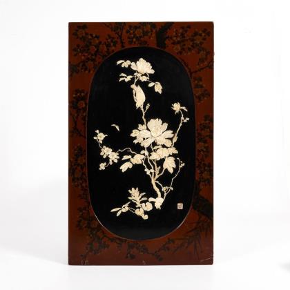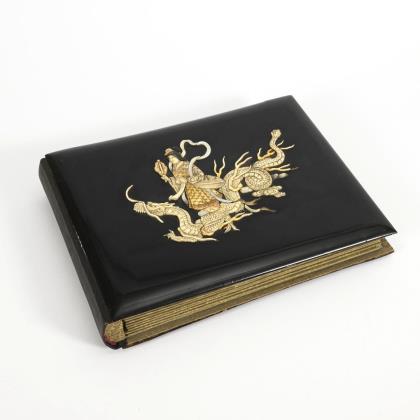 Fotoalbum mit ovalen und rechteckigen Aussparungen für Fotos. Seiten mit verschiedenen Motiven, handbemalt auf Seide. Schwarzer Lackeinband mit Reliefintarsie aus Bein und Perlmutt (stehende Frau auf Drachen)