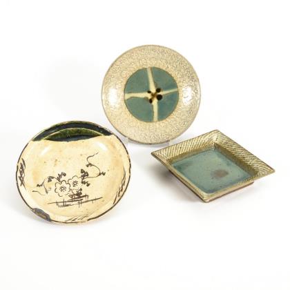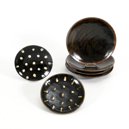 Zwei kleine Teller mit weißem Punktmuster auf schwarzer Glasur und vier größere Teller mit bambusartigem Dekor