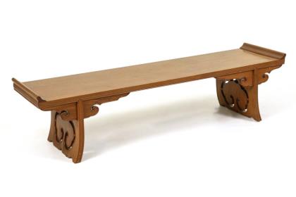 Sitzbank in schlichter Eleganz, Durchbrochen gearbeitete Brettfüße und Zargen in geschwungener Form