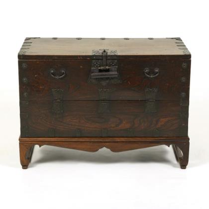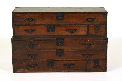 Leichtes, dunkel gebeiztes Holz mit Metallbeschlägen. Jeweils mit drei bzw. fünf unterschiedlichen Schüben; seitlich mit Tragegriffen. Holzverbindungen durch schmale Holzstifte