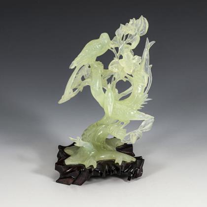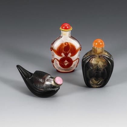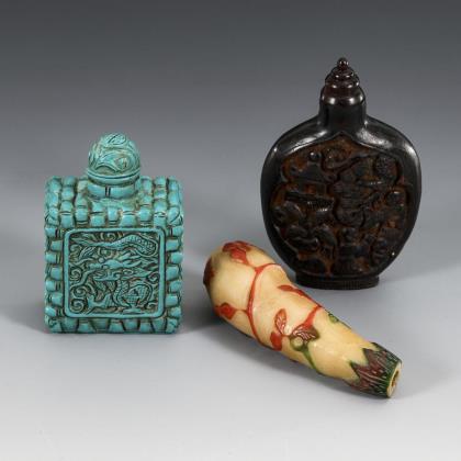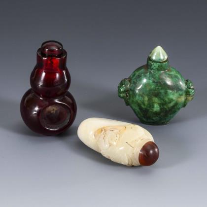 Weißer Stein, Handschmeichler, mit reliefiertem Blatt und Maus. / Flasche in Doppelkürbisform mit dickem, weinrotem Klarglasüberfang. Zwei ausgeschliffene Kartuschen mit Innenmalerei. / Flasche aus grün gemasertem Stein, mit plastischen Taotiemasken. Alle mit Stöpsel