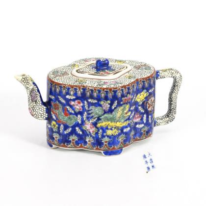 Größere Flasche mit breiten, seitlichen Taotiemasken und je einem Fabelwesen auf den Fronten, in dunkelviolettem Überfang. / Kugelartiger Korpus mit blauem, blattartigem Überfang. /