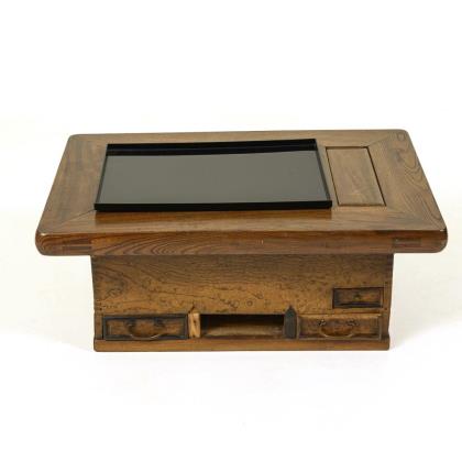 Rechteckiger Korpus mit Griffen und vier kleinen Schubkästen. In der massiven Tischplatte eingelassen ein verzinkter, oben offener Kasten und ein weiteres Fach mit Holzdeckel. Unterbau und Platte in verschiedenen Holzmaserungen. Dazu jüngeres, schwarzes Plastetablett als Abdeckung