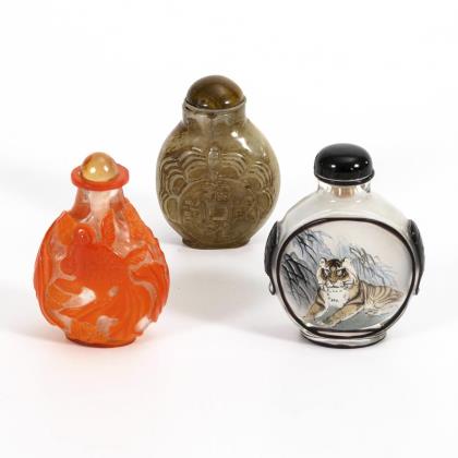 Glasflasche mit schwarzem Überfang und kunstvoller Innenmalerei eines Tigers und Berglandschaft. Seitlich schwarze Taotiemasken. / Flasche aus Klarglas mit Goldfischen im orangem Überfang. / Geschnittene Steinflasche mit Schriftzeichen. Alle mit passenden Stöpseln