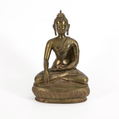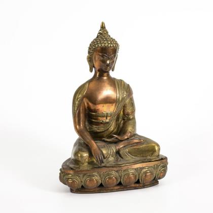 Sitzende Figur auf Lotossockel mit der Geste der Erdberührung. Korpus und Gewand mit messing- und bronzefarbenen Überzügen. Sockel durchbrochen gearbeitet, verschlossener Boden