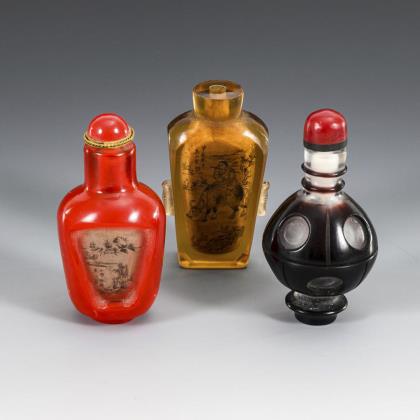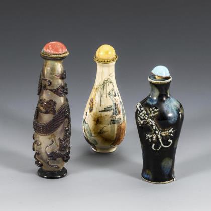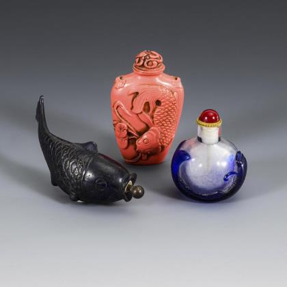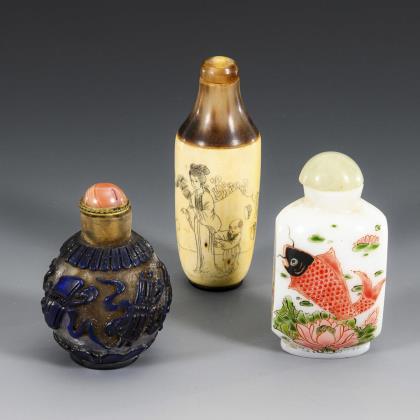 Milchglas mit Karpfen in feiner Emailmalerei, signiert. / Kugelform mit buddhistischen Symbolen, blauer Überfang. Beide mit Stöpsel. / Schlanke Form aus Horn und graviertem Bein, mit Frauenfigur in Gartenlandschaft, dazugehöriger Stöpsel