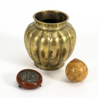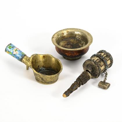 Kleine Gebetsmühle mit Schriftzeichen in Bein, H 15 cm. / Messing-Butterlampe mit Cloisonnégriff. L 13 cm. / Holzschale mit Metalleinsatz, wohl auch als Butterlampe verwendet, Ø 8 cm
