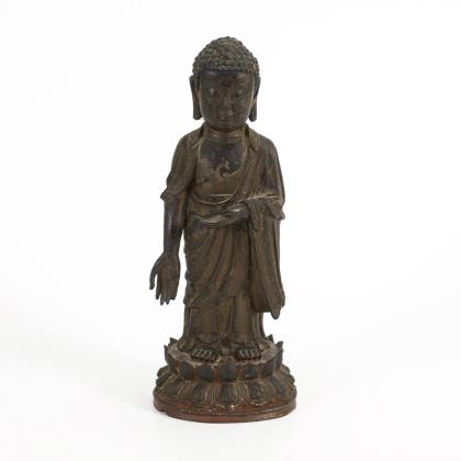 Auf doppeltem Lotossockel stehende Figur mit sehr großen Händen. Musterkanten der Bekleidung fein gearbeitet