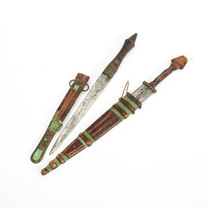 Beide mit konischen Klingen, eines mit Musterbändern auf der Klinge. Eines mit Holzgriff, ein Griff mit Leder ummantelt. Beide mit geprägten Lederscheiden in Rotbraun und Grün, eine mit Metallort