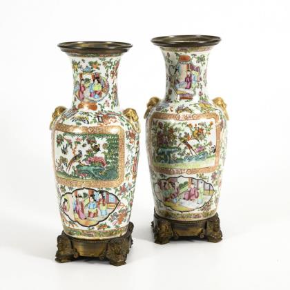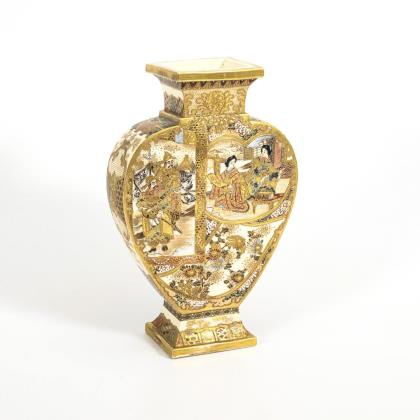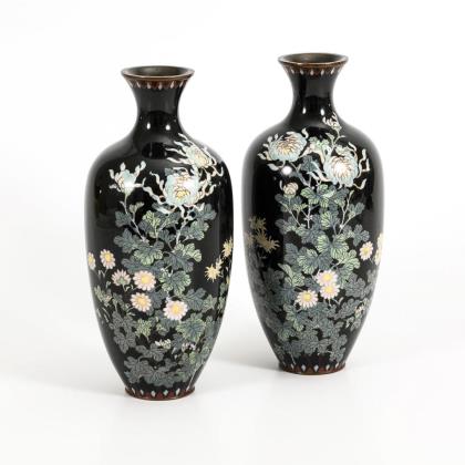 Schlanke Vasen mit Darstellung des Fuji und einiger Pagoden in Berglandschaft in herbstlicher Stimmung bei der kleinen Vase; Frühlingsstimmung mit hängenden Glyzinien bei der großen Vase