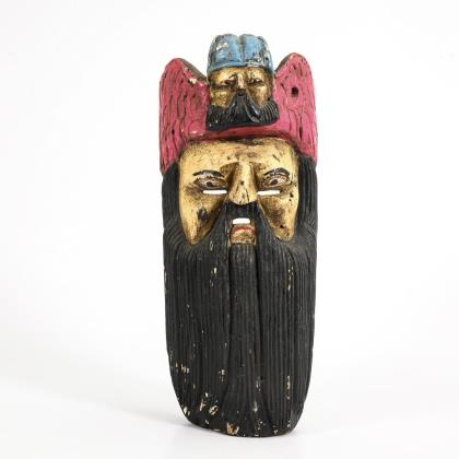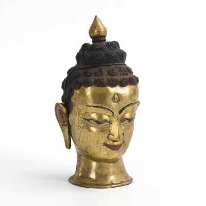 Aus getriebenem Kupferblech gefertigter Kopf, teils farbig gefasst. Einzelne Teile sichtbar ineinandergesteckt oder vernietet
