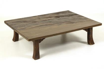 Tischplatte aus zwei verschiedenen Hölzern bestehend. Ein Teil mit gebürsteter Maserung; intarsierte organische Formen aus dem anderen Holz. Dieses in der Oberfläche glatter und mit sichtbaren Verbindungen kunstvoll angesetzt. Beine in leicht geschweifter Form