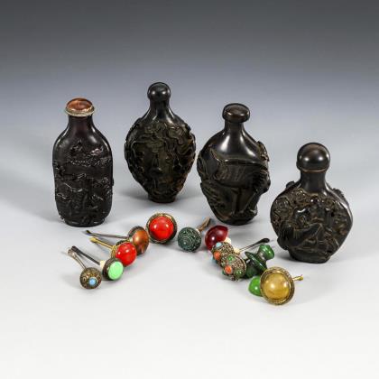 4 Snuffbottles und Konvolut Stöpsel| siehe Nachtrag.