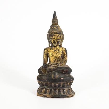 Auf doppeltem Lotossockel sitzende Figur mit der Geste der Erdberührung. Oberkörper mit stark beriebener Vergoldung