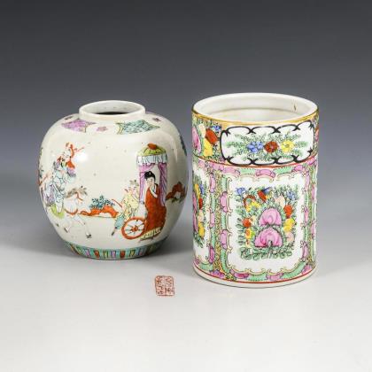 Gelbe Flasche mit rotem und dunkelgrünem Überfang. Je zwei Wasservögel zwischen Lotospflanzen, ohne Stöpsel. / Milchglasflasche mit Pärchen von Goldfischen und Karpfen in rotem und grünem Überfang. / Milchglas mit ähnlichen kunstvollen, figürlichen Szenen in rotem und weißem Überfang. Seitlich Taotiemasken
