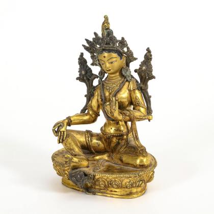 Auf Lotossockel sitzende Frau im lockeren Sitz, ein Fuß auf einer Lotosblüte. In feiner Ausführung bekrönt und geschmückt. Boden verschlossen