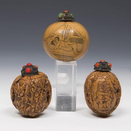 Reliefiert geschnitzt und graviert. Zwei Snuffbottles mit Erotik-Darstellungen. Kürbis mit Schriftzeichen