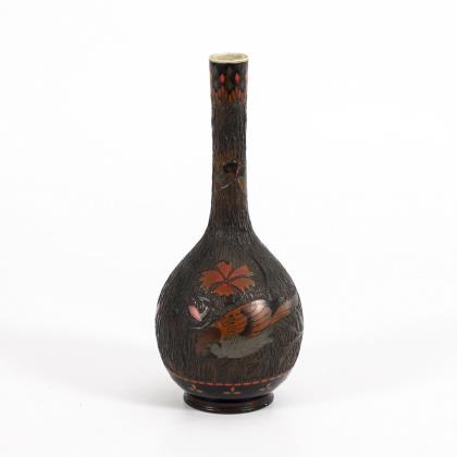 Kugelkorpus mit rot bis rotbraunem Überfang. / Schildkröten über Lotosblatt. / Fisch und Ente über Lotosblatt und stilisierter Blattfries als Musterkante. Alle drei mit Stöpsel