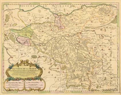 Detaillierte Landkarte der Grafschaft Mark mit der Abtei Essen und der Abtei Wehrden, ornamentale Titelkartusche "Le Comté de La Marck, Les Seigneuries des Abbayes de Werden, D'Essen, et de la Ville Imperiale de Dortmundt", Beikartusche mit Meilenzeigern; 1696 unter Alexis Hubert Jaillot (1632 - 1712) herausgegeben