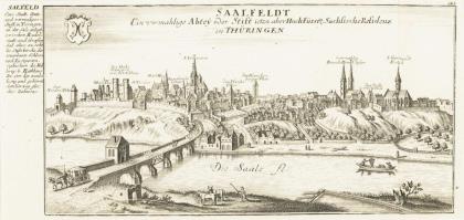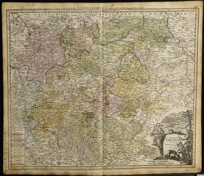 Detailreiche Landkarte der thüringischen Fürstentümer und Grafschaften, mit figürlicher Titelkartusche "Landgraviae Thuringiae tabula generalis in suos principatus [...]", oberer Rand mit Titel in lateinischer Sprache, Legende und Meilenzeigern, ca. 1729, am linken Rand mit handschriftlichen Notizen in Tusche