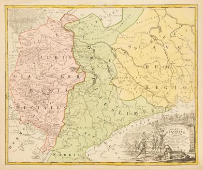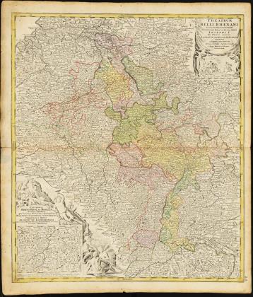 Detaillierte Rheinlaufkarte vom Bodensee bis zur Nordsee, mit figürlicher Titelkartusche "Theatrum Belli Rhenani [...]" und schemenhafter Gesamtansicht von Landau, großer figürlicher Kartusche unten links "Fluviorium Rheni, Mosae ac Mosella [..]" und mit Nebenkarte des Quellgebietes des Rheins, Legende und Meilenzeigern, ca. 1720