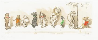 Humorvolles Werk mit Hunden in einer Schlange zum Wasserlassen: "der Reihe nach"