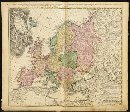 Detaillierte, zur damaligen Zeit bahnbrechende Landkarte des Obersten Feldpostmeisters Johann Peter Nell zu Damenacher (1672 -1743) mit Postwegen und Poststationen durch Deutschland, mit den angrenzenden Ländern, heraldische Titelkartusche "Illustrissimo ac Excellentissimo Domino Dno Carolo Josepho [...]", mit Titel in lateinischer Sprache am oberen Rand "Postarum seu Veredariorum Stationes per Germaniam et Provincias Adiacentes", Titel in deutscher Sprache unten rechts "Neu-vermehrte Post-Charte durch gantz Teutschland nach Italien, Franckreich, Niederland, Preußen, Polen und Ungarn etc.", Legende und Meilenzeigern, ca. 1720