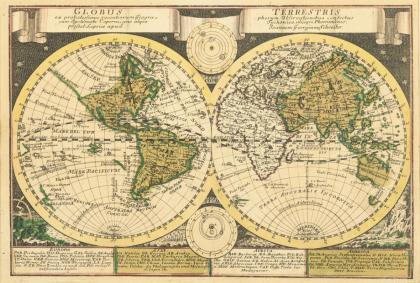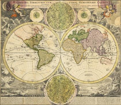 Äußerst dekorative Weltkarte der östlichen und westlichen Hemisphäre, 2 weitere Hemisphären mit dem nördlichen und südlichen Sternenhimmel mit den Sternbildern, Darstellung der Sommer- und Wintersonnenwende, Titelkartusche mit Spruchband "Planiglobii Terrestris Cum Utroq Hemisphærio Cælesti Generalis", gehalten von 2 Putten, die Tag und Nacht symbolisieren; reich dekoriert mit detaillierten Darstellungen von Göttern des Windes und Naturphänomenen, Beschreibung der Naturphänomene in lateinischer Sprache; erstmals erschienen in Johann Baptist Homanns Ältestem Atlas von 1707