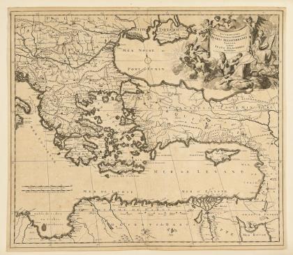 Detaillierte Landkarte des Mittelmeerraumes, große figürliche Titelkartusche "Accuratissima orientalioris districtus maris Mediterranei tabula", Meilenzeiger