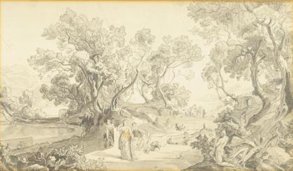 GLEICHEN-RUSSWURM, Heinrich Ludwig von (1836 Schloss Greifenstein - 1901 Weimar). Violine spielende Frauengestalt an einer Waldlichtung.