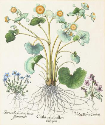 Präzise Darstellung einer Sumpfdotterblume "Caltha palustris flore multiplici", eines Hundsveilchens "Viola Martia Canina" und eines Frühlingsenzians "Gentianella minima verna flore caeulio", Bildtafel 113 aus dem botanischen Prachtwerk "Hortus Eystettensis" (Eichstätter Garten) mit 1100 Pflanzen aus aller Welt, das 1613 erstmals in sogenannter Königsgröße (55 x 47 cm) herausgegeben wurde