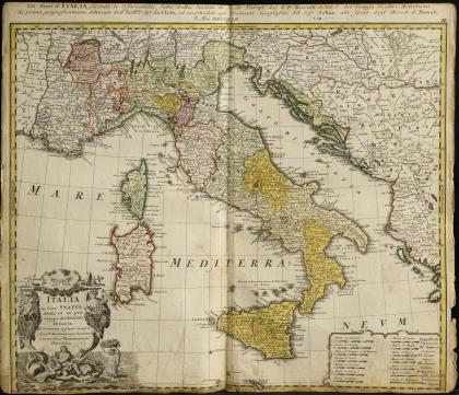 Detaillierte Landkarte der nördlichen Teils von Italien, mit Venetien, Mantua, Emilia-Romagna und dem Golf von von Venedig, figürliche Titelkartusche "Dominii Veneti cum Vicinis Parmae Mutinae Mantuae et Mirandoli [...]", Legende und Meilenzeigern, ca. 1725