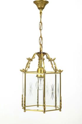 1-flammige Deckenlaterne mit 6-eckigem, facettiert verglastem Korpus mit Kerbdekor, an geschweiften Streben mit Kettenaufhängung und Glockenbaldachin