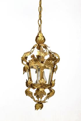 1-flammige Deckenlaterne an Kettenaufhängung mit Palmettenbaldachin, 6-fach verglaster Korpus mit üppigem Akanthusblattdekor