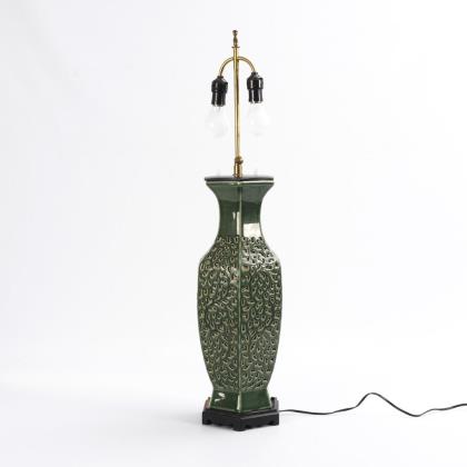 Hexagonaler Balusterkorpus allseits mit feinem Durchbruch-Ornament versehen, das von der Lampe im Inneren hinterleuchtet werden kann. Auf der Abdeckung 2 Schalter für die Innenleuchte bzw. für die beiden Schraubfassung an der höhenverstellbaren Strebe. Die Fassungen sind extra noch einmal schaltbar
