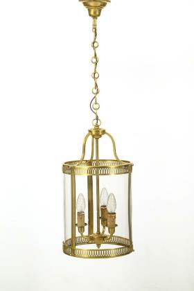 3-flammige Deckenlaterne mit zylinderförmigem Korpus mit geschweiften Streben, an Kettenaufhängung mit Glockenbaldachin