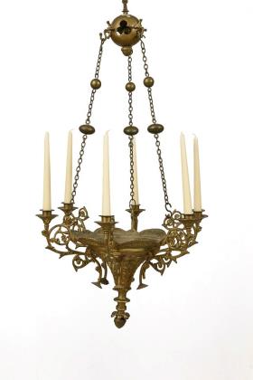 6-flammiger Deckenleuchter an Kettenaufhängung und Kugelbaldachin mit durchbrochen gearbeiteten Dreipass-Ornamenten. Trompetenförmiger Korpus mit reliefierter Floralzierde, Zapfenabhängung und 6 Volutenarmen mit Kerzentüllen