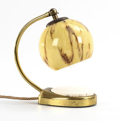 Messingfuß, übergroßer weißer Tastschalter, gebogter Arm mit schwenkbarer Schraubfassung, Kugelglasschirm
