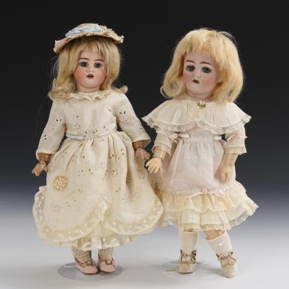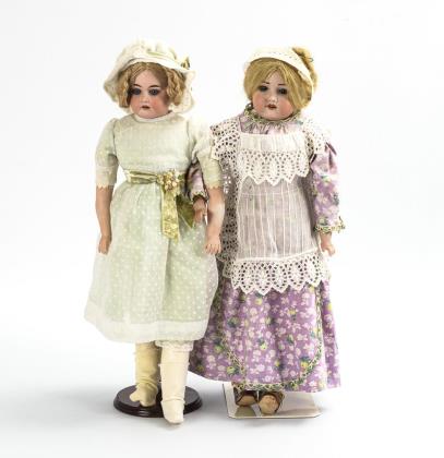 Beide mit Brustkopf, Glasaugen, geschlossenem Mund und Mohairperücke. Stoffkörper mit Massegliedern. Jeweils weißes Kleid, 1x mit modellierten Stiefelchen, 1x mit schwarzen Strümpfen ohne Schuhe