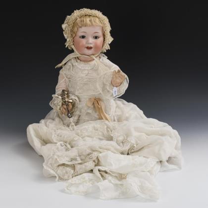 Kurbelkopf, blaue Schlafaugen, blonde Mohairperücke, 5-teiliger Sitzbabykörper mit verstummter Stimme. Langes weißes Kleid, Häubchen, silberfarbene Babyrassel