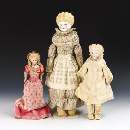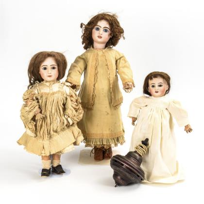 In verschiedenen Größen: 2x Pariantyp aus Biskuit, 1x mit glasiertem Kopf. Körper: 2x Leder, 1x Stoff, jeweils mit Biskuitarmen. 2x helles Kleid, 1x rosa