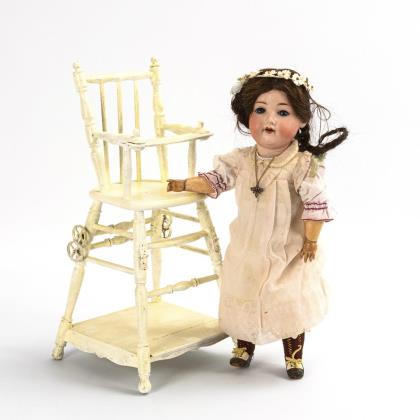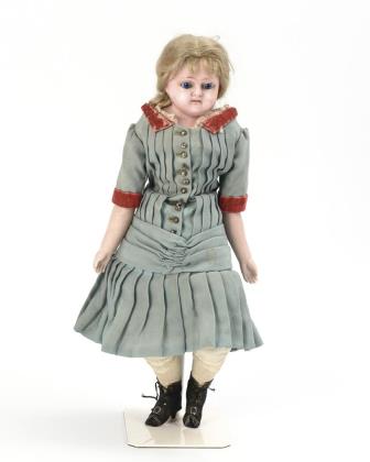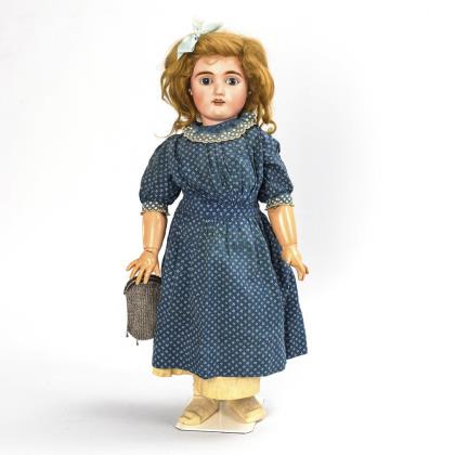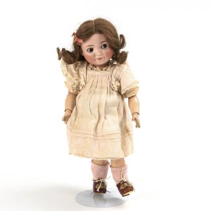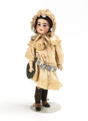 Kurbelkopf, braune Schlafaugen mit beriebenen Lidern, blonde Mohairperücke. 11-teiliger Gliederkörper. Weißes Kleid mit rosa Unterkleid, rosa Ballbüchlein mit Eintragungen von 1896, passender Stoffhut, braune Lederschuhe