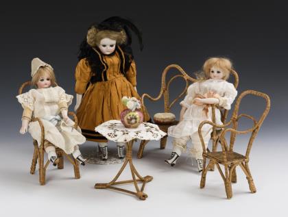 Sitzgruppe aus Rattangeflecht und 3 Puppen.